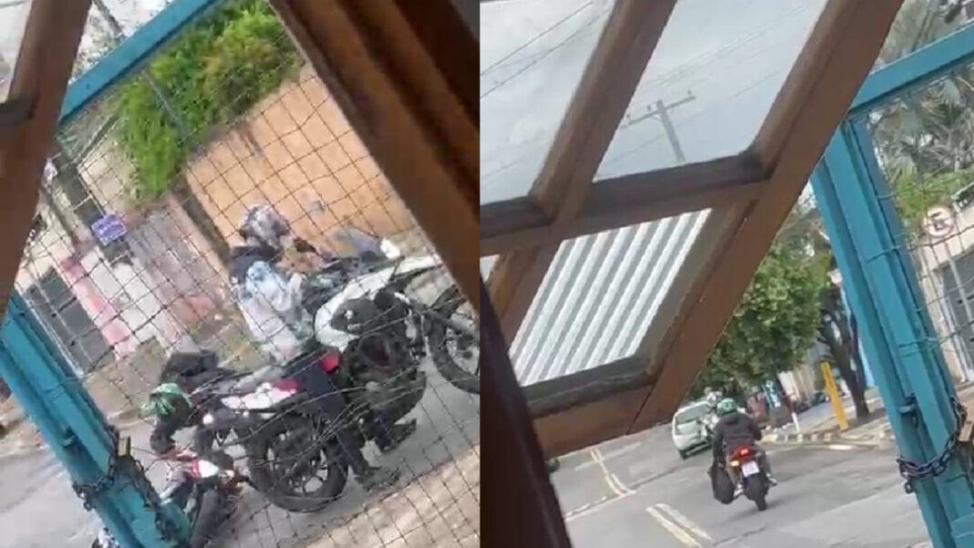 Nas imagens, gravadas de dentro de um imóvel, com um celular apontado para a via pública, é possível ver os suspeitos ordenando que o proprietário da moto se afaste e deixe o veículo caído no chão. A vítima sai correndo em seguida.
