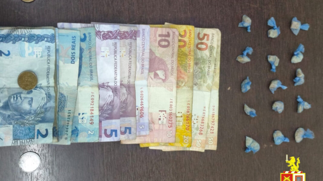 Durante a revista, os policiais encontraram duas porções de crack e dinheiro no bolso da bermuda. Na tentativa de enganar a equipe, o homem deu um passo à frente para esconder um saquinho que havia deixado cair próximo ao seu pé, mas a manobra foi vista pelos agentes.