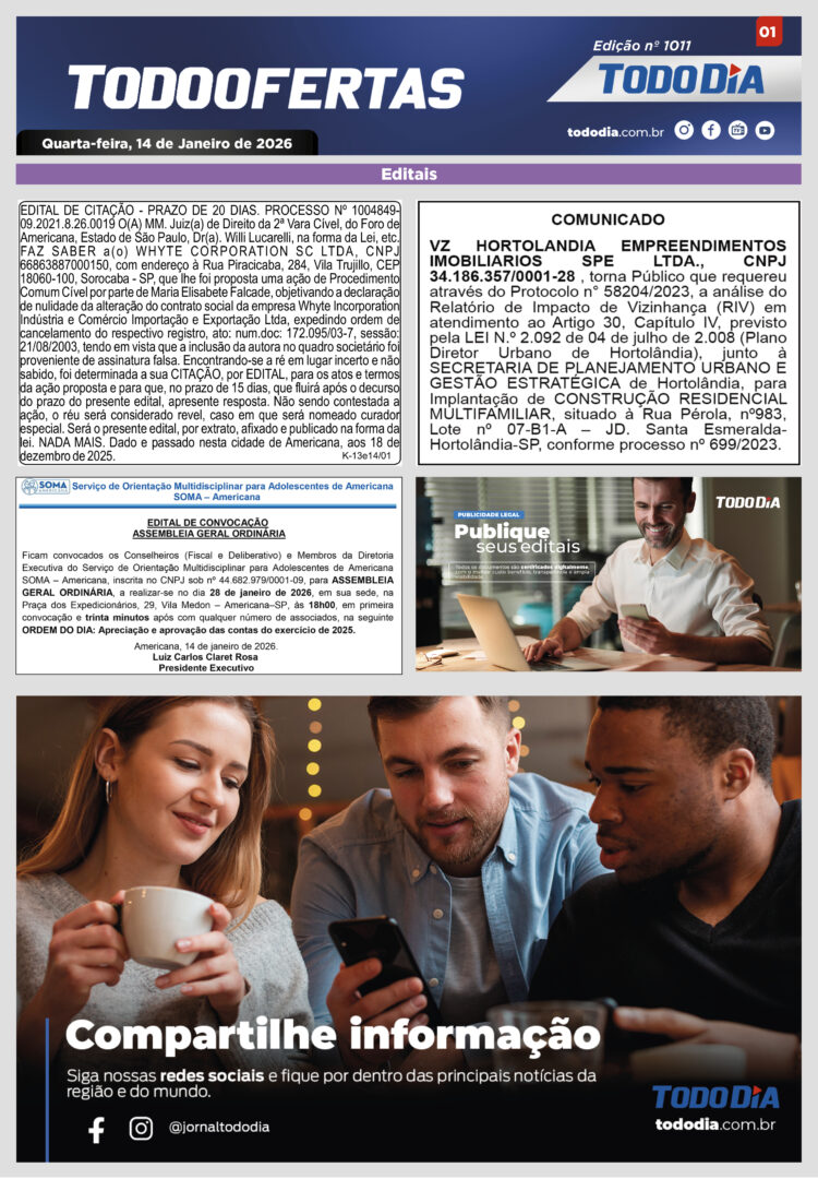 Todo Ofertas Todo Ofertas – Edição nº 1011 Por Publicidade Legal 14 de janeiro de 2026 00h00 FacebookTwitterLinkedinWhatsAppO emailCopy URL Veja Também Portal Jornal TODODIA – 02-04-26 – ED. 1242 Sem categoria Em busca do peixe: Mercadão de Campinas registra movimento intenso Polícia Mulher tem aliança roubada por homem armado em frente da própria casa em Hortolândia Portal Jornal TODODIA – 02-04-26 – ED. 1242 Sem categoria Em busca do peixe: Mercadão de Campinas registra movimento intenso