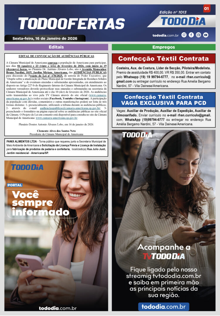 Todo Ofertas Todo Ofertas – Edição nº 1013 Por Publicidade Legal 16 de janeiro de 2026 07h00 FacebookTwitterLinkedinWhatsAppO emailCopy URL Veja Também Cidades Festival Caipira de Circo ocupa o Engenho Central com arte, diversidade e acesso gratuito Polícia Cooperativas promovem palestra sobre violência doméstica em Santa Bárbara TV TodoDia Participe do 2º dia da ‘Novena de São Sebastião’ com Padre Manzotti nesta sexta-feira, às 10h Cidades Festival Caipira de Circo ocupa o Engenho Central com arte, diversidade e acesso gratuito Polícia Cooperativas promovem palestra sobre violência doméstica em Santa Bárbara