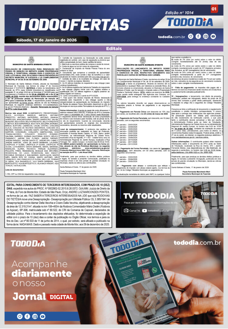 Todo Ofertas Todo Ofertas – Edição nº 1014 Por Publicidade Legal 17 de janeiro de 2026 07h00 FacebookTwitterLinkedinWhatsAppO emailCopy URL Veja Também Portal Jornal TODODIA – 02-04-26 – ED. 1242 Sem categoria Em busca do peixe: Mercadão de Campinas registra movimento intenso Polícia Mulher tem aliança roubada por homem armado em frente da própria casa em Hortolândia Portal Jornal TODODIA – 02-04-26 – ED. 1242 Sem categoria Em busca do peixe: Mercadão de Campinas registra movimento intenso