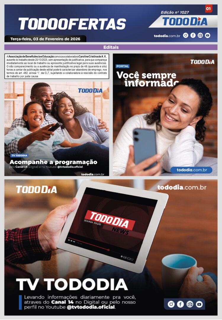 Todo Ofertas Todo Ofertas – Edição nº 1027 Por Publicidade Legal 3 de fevereiro de 2026 10h00 FacebookTwitterLinkedinWhatsAppO emailCopy URL Veja Também Portal Jornal TODODIA – 02-04-26 – ED. 1242 Sem categoria Em busca do peixe: Mercadão de Campinas registra movimento intenso Polícia Mulher tem aliança roubada por homem armado em frente da própria casa em Hortolândia Portal Jornal TODODIA – 02-04-26 – ED. 1242 Sem categoria Em busca do peixe: Mercadão de Campinas registra movimento intenso