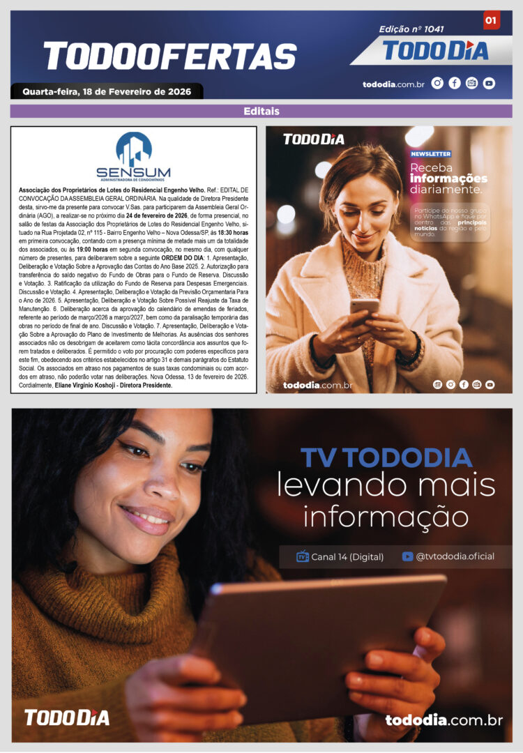 Todo Ofertas Todo Ofertas – Edição nº 1041 Por Publicidade Legal 18 de fevereiro de 2026 13h00 FacebookTwitterLinkedinWhatsAppO emailCopy URL Veja Também Portal Jornal TODODIA – 02-04-26 – ED. 1242 Sem categoria Em busca do peixe: Mercadão de Campinas registra movimento intenso Polícia Mulher tem aliança roubada por homem armado em frente da própria casa em Hortolândia Portal Jornal TODODIA – 02-04-26 – ED. 1242 Sem categoria Em busca do peixe: Mercadão de Campinas registra movimento intenso
