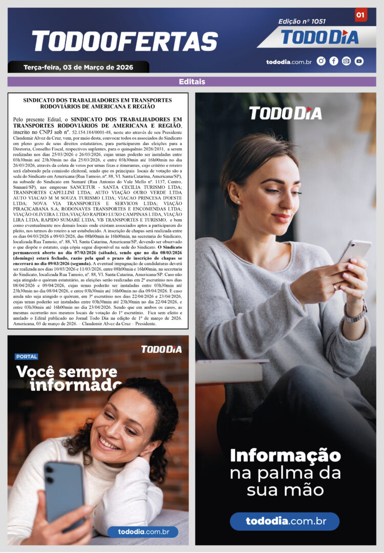 Todo Ofertas Todo Ofertas – Edição nº 1051 Por Publicidade Legal 3 de março de 2026 08h00 FacebookTwitterLinkedinWhatsAppO emailCopy URL Veja Também Americana Jovem fica ferido após acidente entre carro e moto na SP-304 em Americana Polícia Ex-jogador Piá tenta fugir, invade condomínio e acaba preso em Sumaré Painel Regional Internet em Santa Bárbara d’Oeste: estabilidade, cobertura por bairro e o novo padrão de qualidade em 2026 Americana Jovem fica ferido após acidente entre carro e moto na SP-304 em Americana Polícia Ex-jogador Piá tenta fugir, invade condomínio e acaba preso em Sumaré