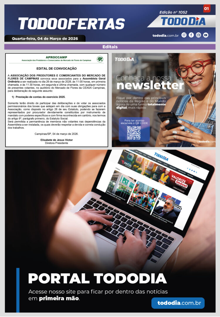 Todo Ofertas Todo Ofertas – Edição nº 1052 Por Publicidade Legal 4 de março de 2026 09h00 FacebookTwitterLinkedinWhatsAppO emailCopy URL Veja Também Polícia Dupla é presa por roubo à joalheria em Nova Odessa; rede foi assaltada quatro vezes em menos de um ano Cosmópolis Alunos da Escola Estadual Alberto Fierz agem contra descarte irregular em Cosmópolis Hortolândia Prazo de adesão ao Refis 2025 de Hortolândia termina na próxima terça-feira (31) Polícia Dupla é presa por roubo à joalheria em Nova Odessa; rede foi assaltada quatro vezes em menos de um ano Cosmópolis Alunos da Escola Estadual Alberto Fierz agem contra descarte irregular em Cosmópolis