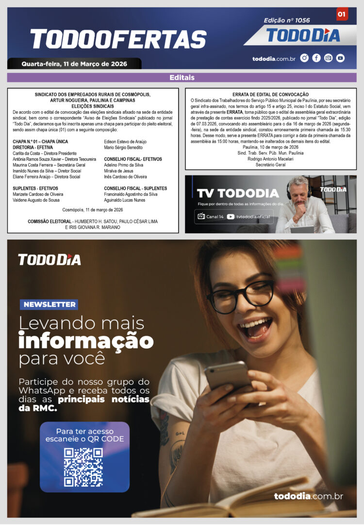 Todo Ofertas Todo Ofertas – Edição nº 1056 Por Publicidade Legal 11 de março de 2026 07h52 FacebookTwitterLinkedinWhatsAppO emailCopy URL Veja Também Cidades Dívida de R$ 65 bi e unidade em Piracicaba: Raízen protocola pedido de recuperação extrajudicial Campinas Estado formaliza doação de terreno para construção do Hospital Metropolitano em Campinas TV TodoDia Terceiro dia do ‘Tríduo pela Cura Interior’: confira na TV TODODIA Cidades Dívida de R$ 65 bi e unidade em Piracicaba: Raízen protocola pedido de recuperação extrajudicial Campinas Estado formaliza doação de terreno para construção do Hospital Metropolitano em Campinas