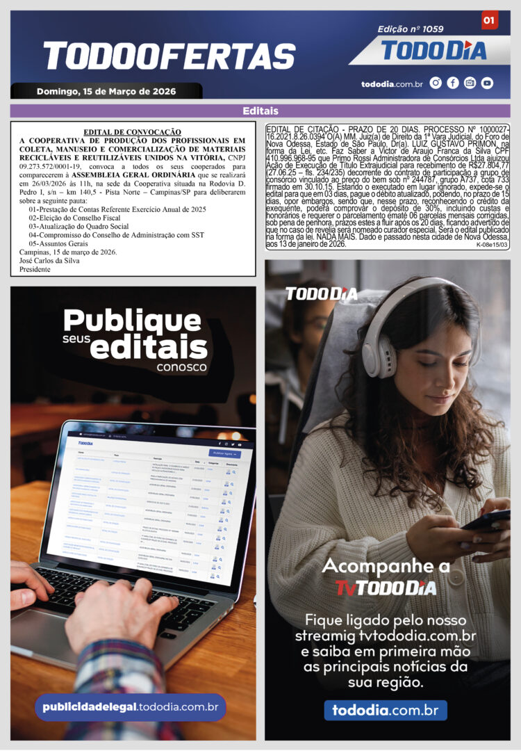 Todo Ofertas Todo Ofertas – Edição nº 1059 Por Publicidade Legal 15 de março de 2026 00h00 FacebookTwitterLinkedinWhatsAppO emailCopy URL Veja Também Portal Jornal TODODIA – 14-03-26 – ED. 1223 Campinas Haitianos retidos em Viracopos iniciam pedidos de refúgio com apoio da Defensoria e da ONU Americana Americana conquista ouro no Circuito Paulista com atleta de apenas nove anos Portal Jornal TODODIA – 14-03-26 – ED. 1223 Campinas Haitianos retidos em Viracopos iniciam pedidos de refúgio com apoio da Defensoria e da ONU