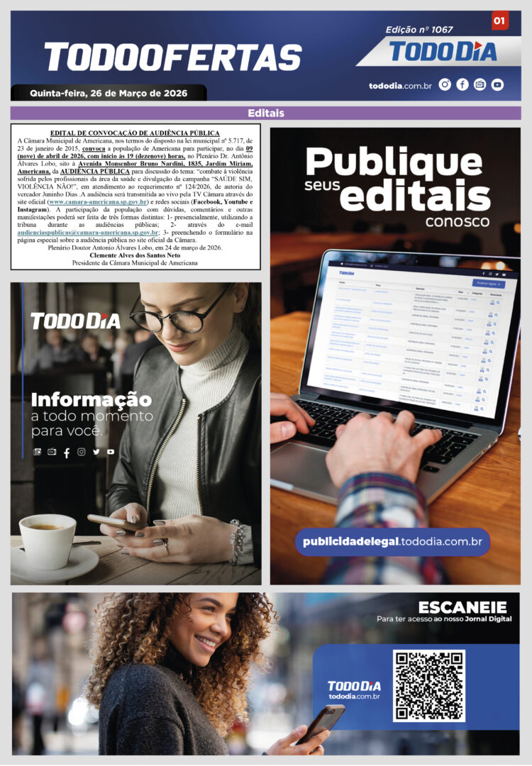 Todo Ofertas Todo Ofertas – Edição nº 1067 Por Publicidade Legal 26 de março de 2026 07h51 FacebookTwitterLinkedinWhatsAppO emailCopy URL Veja Também Portal Jornal TODODIA – 02-04-26 – ED. 1242 Sem categoria Em busca do peixe: Mercadão de Campinas registra movimento intenso Polícia Mulher tem aliança roubada por homem armado em frente da própria casa em Hortolândia Portal Jornal TODODIA – 02-04-26 – ED. 1242 Sem categoria Em busca do peixe: Mercadão de Campinas registra movimento intenso