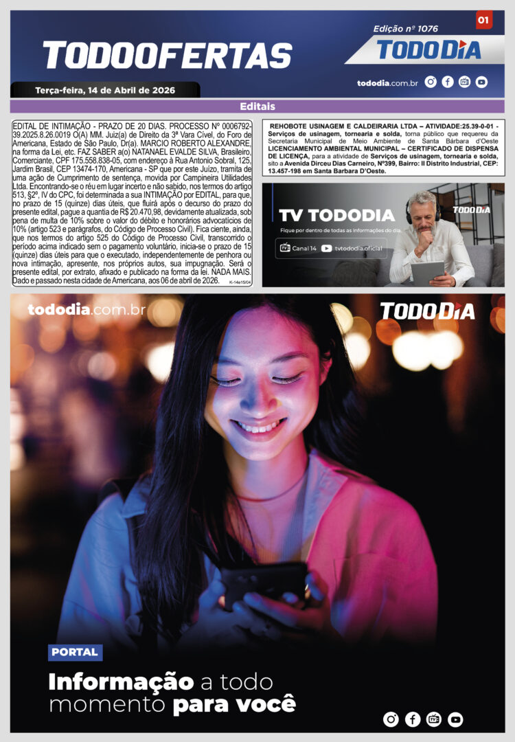 Todo Ofertas Todo Ofertas – Edição nº 1076 Por Publicidade Legal 14 de abril de 2026 07h00 FacebookTwitterLinkedinWhatsAppO emailCopy URL Veja Também Americana Homem encontrado morto no Rio Piracicaba, em Americana, é identificado como Leandro Aparecido Varandas Americana Golpistas se passam por profissionais de saúde e usam falsa vacinação como pretexto para enganar moradores em Americana TV TodoDia Assista ao oitavo dia da ‘Novena Jesus Ressuscitado, Rolai as Pedras do Caminho’ na TV TODODIA Americana Homem encontrado morto no Rio Piracicaba, em Americana, é identificado como Leandro Aparecido Varandas Americana Golpistas se passam por profissionais de saúde e usam falsa vacinação como pretexto para enganar moradores em Americana