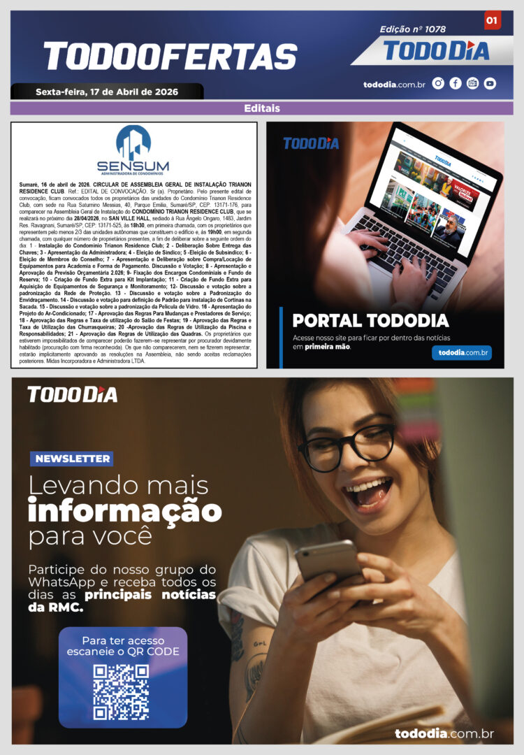 Todo Ofertas Todo Ofertas – Edição nº 1078 Por Publicidade Legal 17 de abril de 2026 07h09 FacebookTwitterLinkedinWhatsAppO emailCopy URL Veja Também Sem categoria Jornal TODODIA – 20-04-26 – ED. 1260 Polícia Equipe do canil do Baep prende homem por tráfico de drogas na Vila Valle, em Sumaré RMC - Região Metropolitana de Campinas Rodovias da região devem ter movimento intenso no retorno do feriadão Sem categoria Jornal TODODIA – 20-04-26 – ED. 1260 Polícia Equipe do canil do Baep prende homem por tráfico de drogas na Vila Valle, em Sumaré