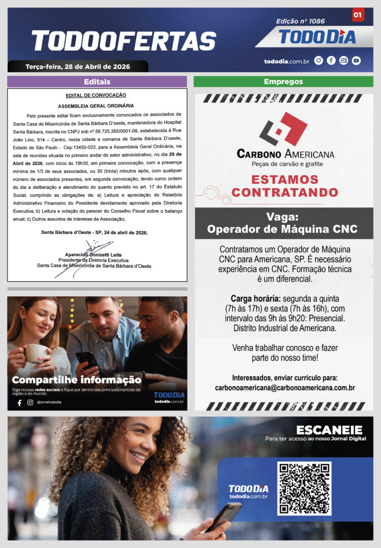 Todo Ofertas Todo Ofertas – Edição nº 1086 Por Publicidade Legal 28 de abril de 2026 07h02 FacebookTwitterLinkedinWhatsAppO emailCopy URL Veja Também Americana Marcio Leal deixa secretaria de Esportes de Americana para coordenar campanha de Franco Sardelli; Pedro Peol assume interinamente TV TodoDia Segundo dia da ‘Novena da Mãe de Todas as Mães’: acompanhe na TV TODODIA Cultura Angra, CPM 22, Raimundos e Fresno: anunciadas as principais atrações do Rock Fest 2026, em Santa Bárbara Americana Marcio Leal deixa secretaria de Esportes de Americana para coordenar campanha de Franco Sardelli; Pedro Peol assume interinamente TV TodoDia Segundo dia da ‘Novena da Mãe de Todas as Mães’: acompanhe na TV TODODIA