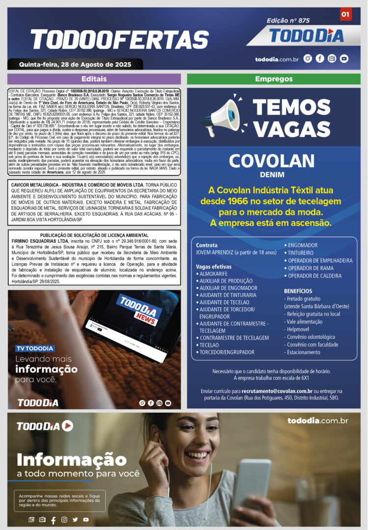 Todo Ofertas Todo Ofertas – Edição nº 875 Por Publicidade Legal 28 de agosto de 2025 07h46 FacebookTwitterLinkedinWhatsAppO emailCopy URL Veja Também Polícia Polícia Militar Ambiental flagra criação de animais e desmatamento em área verde protegida em Sumaré Americana Soma forma mais uma turma e chega a 15 mil jovens capacitados para o mercado de trabalho TV TodoDia Segundo dia do ‘Tríduo de Cura e Libertação pelo Sangue de Jesus’: assista na TV TODODIA Polícia Polícia Militar Ambiental flagra criação de animais e desmatamento em área verde protegida em Sumaré Americana Soma forma mais uma turma e chega a 15 mil jovens capacitados para o mercado de trabalho