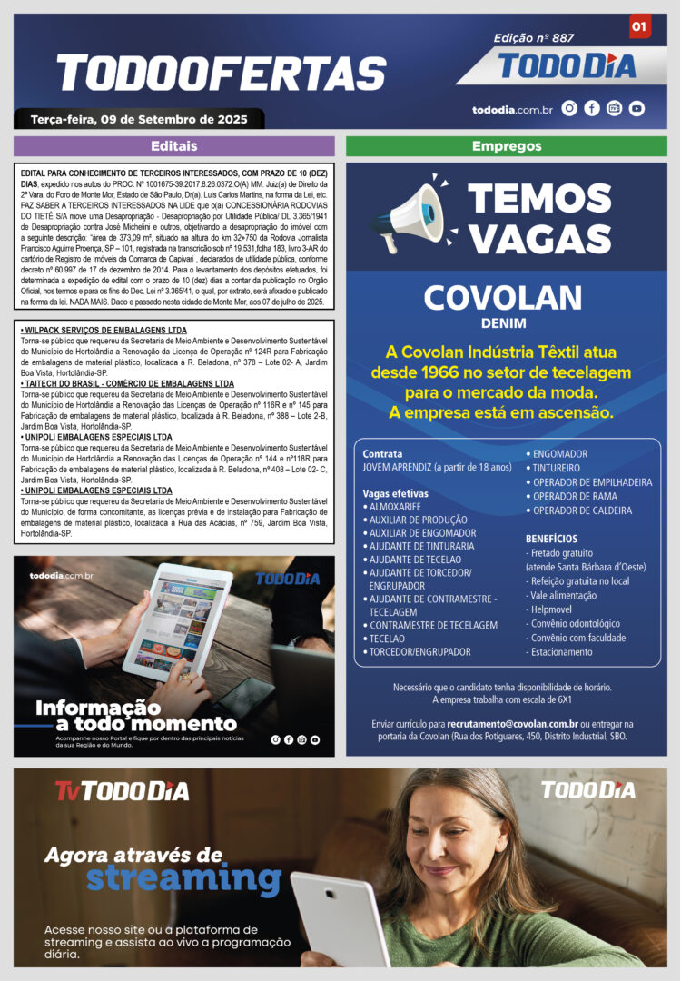 Todo Ofertas Todo Ofertas – Edição nº 887 Por Publicidade Legal 9 de setembro de 2025 07h54 FacebookTwitterLinkedinWhatsAppO emailCopy URL Veja Também TV TodoDia Segundo dia do ‘Tríduo de Cura e Libertação pelo Sangue de Jesus’: assista na TV TODODIA Paulínia Maratoninha Kids 2026 abre temporada em Paulínia neste sábado (4) Portal Jornal TODODIA – 02-04-26 – ED. 1242 TV TodoDia Segundo dia do ‘Tríduo de Cura e Libertação pelo Sangue de Jesus’: assista na TV TODODIA Paulínia Maratoninha Kids 2026 abre temporada em Paulínia neste sábado (4)