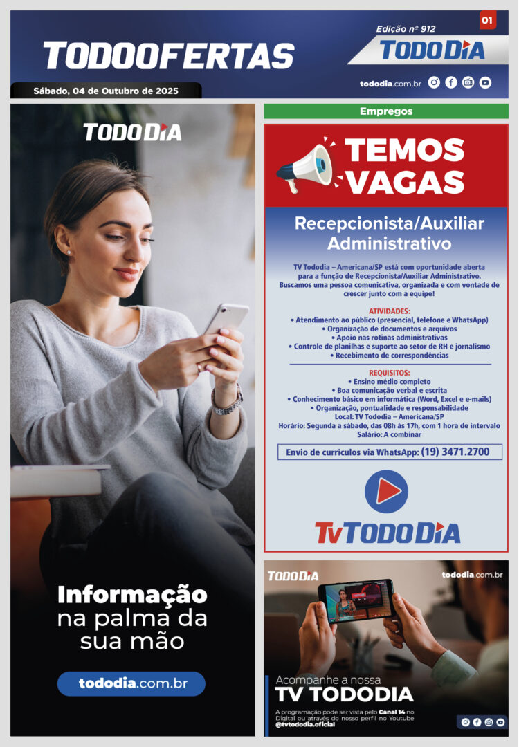 Todo Ofertas Todo Ofertas – Edição nº 912 Por Publicidade Legal 4 de outubro de 2025 07h00 FacebookTwitterLinkedinWhatsAppO emailCopy URL Veja Também Portal Jornal TODODIA – 29-10-25 – ED. 1089 Cidades Vereador Léo do LM (PSB) deixa a Câmara de Hortolândia após cassação; Nei Prazeres (PP) assume a vaga Cidades Prefeito homenageia comitiva de multinacional coreana e discute novos investimentos em Limeira Portal Jornal TODODIA – 29-10-25 – ED. 1089 Cidades Vereador Léo do LM (PSB) deixa a Câmara de Hortolândia após cassação; Nei Prazeres (PP) assume a vaga