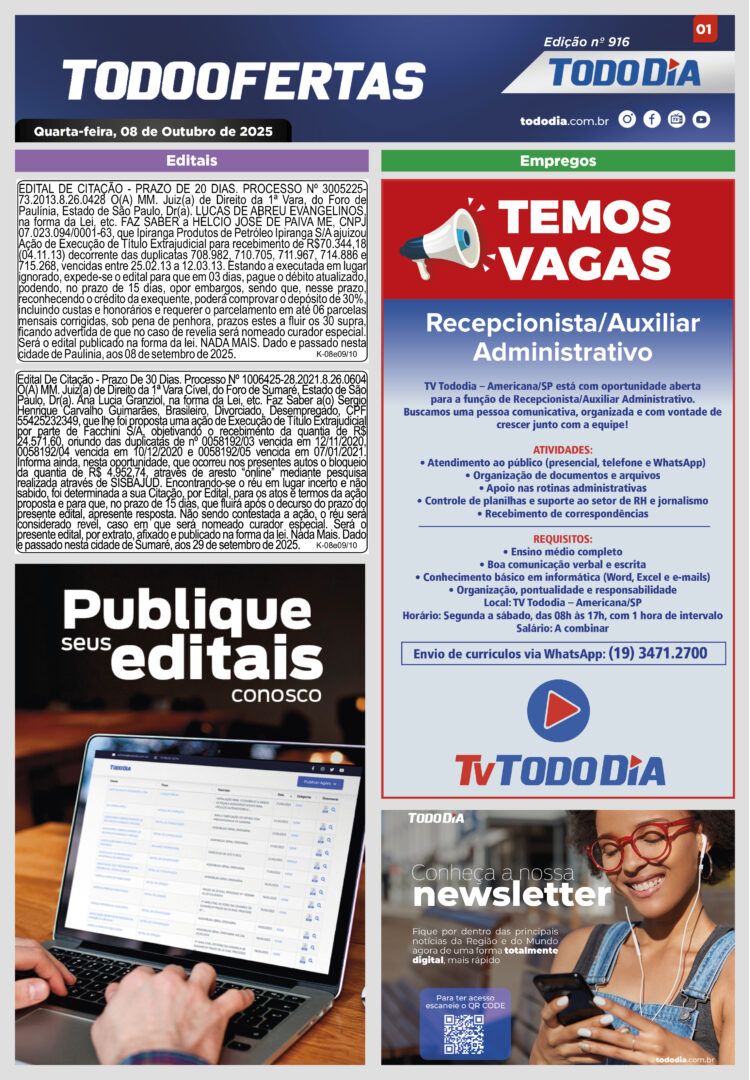 Todo Ofertas Todo Ofertas – Edição nº 916 Por Publicidade Legal 8 de outubro de 2025 07h30 FacebookTwitterLinkedinWhatsAppO emailCopy URL Veja Também Polícia Polícia Civil apreende mais de 300 garrafas de uísque falsificado em Campinas Campinas Unicamp inicia comemorações pelos 60 anos com selo e festa cultural no Teatro de Arena Brasil + Mundo Governo restringe antecipação de saque-aniversário do FGTS Polícia Polícia Civil apreende mais de 300 garrafas de uísque falsificado em Campinas Campinas Unicamp inicia comemorações pelos 60 anos com selo e festa cultural no Teatro de Arena