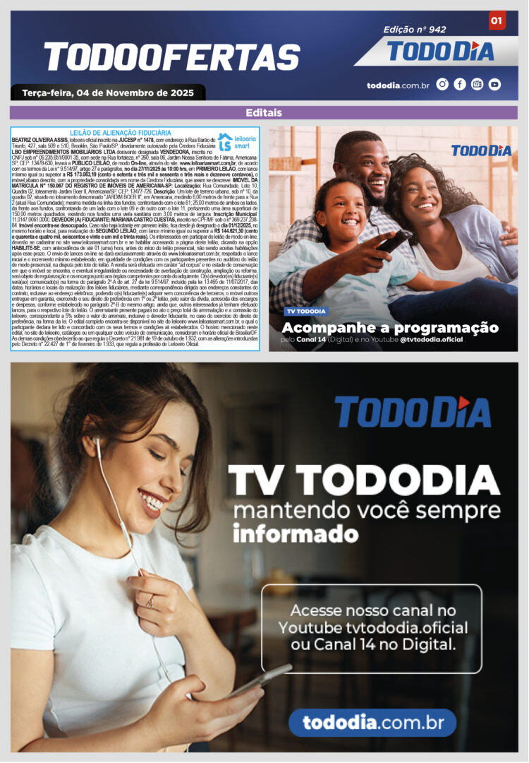 Todo Ofertas Todo Ofertas – Edição nº 942 Por Publicidade Legal 4 de novembro de 2025 07h00 FacebookTwitterLinkedinWhatsAppO emailCopy URL Veja Também Americana Trem Iluminado encanta moradores e leva clima de Natal à linha férrea de Americana Polícia Duas toneladas de drogas são incineradas em ação da Polícia Civil Americana Com ressalvas sobre mobilidade, vereadores de Americana aprovam doação de terreno para sede da Câmara Municipal Americana Trem Iluminado encanta moradores e leva clima de Natal à linha férrea de Americana Polícia Duas toneladas de drogas são incineradas em ação da Polícia Civil