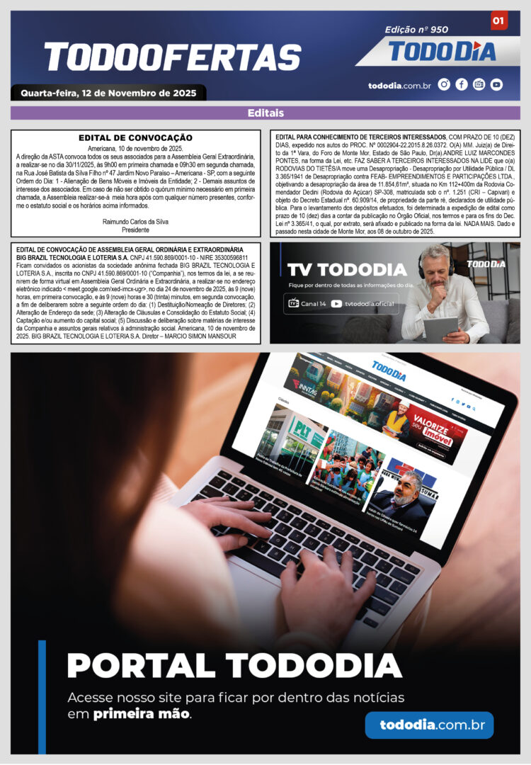 Todo Ofertas Todo Ofertas – Edição nº 950 Por Publicidade Legal 12 de novembro de 2025 08h46 FacebookTwitterLinkedinWhatsAppO emailCopy URL Veja Também Polícia PF faz operação em endereços ligados ao ex-prefeito de Limeira Mário Botion TV TodoDia Acompanhe o 9º dia da Novena de ‘Jesus das Santas Chagas pelas famílias’ com Padre Manzotti nesta quarta-feira, às 10h Polícia Polícia Civil encerra bingo clandestino com mais de 70 máquinas no Centro de Campinas Polícia PF faz operação em endereços ligados ao ex-prefeito de Limeira Mário Botion TV TodoDia Acompanhe o 9º dia da Novena de ‘Jesus das Santas Chagas pelas famílias’ com Padre Manzotti nesta quarta-feira, às 10h