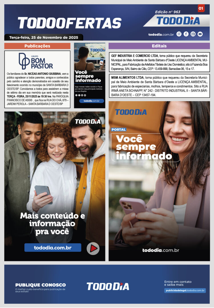 Todo Ofertas Todo Ofertas – Edição nº 963 Por Publicidade Legal 25 de novembro de 2025 07h29 FacebookTwitterLinkedinWhatsAppO emailCopy URL Veja Também TV TodoDia Chegamos ao 2º dia da novena! Fortaleça sua fé com a ‘Novena de Nossa Senhora das Graças’ com Padre Manzotti nesta terça-feira, às 10h Polícia Entenda tudo sobre a rebelião em presídio de Hortolândia Polícia ‘Operação Sossego’ da Polícia Municipal de Sumaré termina com 16 estabelecimentos fechados TV TodoDia Chegamos ao 2º dia da novena! Fortaleça sua fé com a ‘Novena de Nossa Senhora das Graças’ com Padre Manzotti nesta terça-feira, às 10h Polícia Entenda tudo sobre a rebelião em presídio de Hortolândia