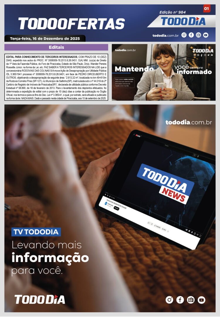 Todo Ofertas Todo Ofertas – Edição nº 984 Por Publicidade Legal 16 de dezembro de 2025 06h55 FacebookTwitterLinkedinWhatsAppO emailCopy URL Veja Também Cidades Em sessão turbulenta, vereadores recuam e projeto que prevê aumento do IPTU não é votado em Piracicaba Americana Trem Iluminado de Natal da Rumo chega a Americana Cidades Seis projetos enviados pelo prefeito Leitinho são aprovados em regime de urgência pela Câmara de Nova Odessa Cidades Em sessão turbulenta, vereadores recuam e projeto que prevê aumento do IPTU não é votado em Piracicaba Americana Trem Iluminado de Natal da Rumo chega a Americana